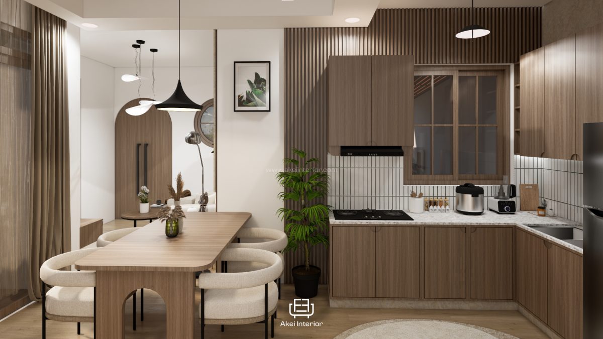 Area makan dan dapur dirancang menyatu tanpa sekat tinggi, menciptakan alur aktivitas yang efisien dan interaksi keluarga yang lebih dekat. Dominasi warna netral dan elemen kayu menghadirkan suasana hangat khas Japandi, sedangkan bukaan yang lapang memungkinkan cahaya alami mengalir bebas ke seluruh area. Hasilnya, ruangan terasa terang dan lega, membuat momen memasak dan bersantap menjadi lebih menyenangkan.